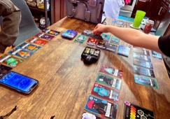 In Globot Time Force, players compete to create a tableau and engine of up to 7 cards and score the most points earned by those cards, achievements, and resourced earned during the game.